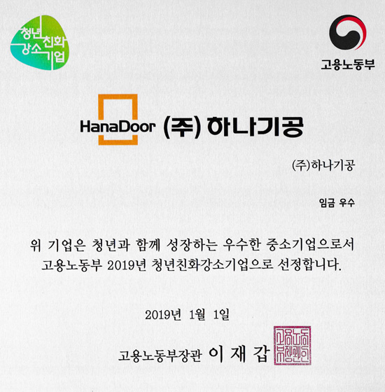 2019 청년친화 강소기업 상패