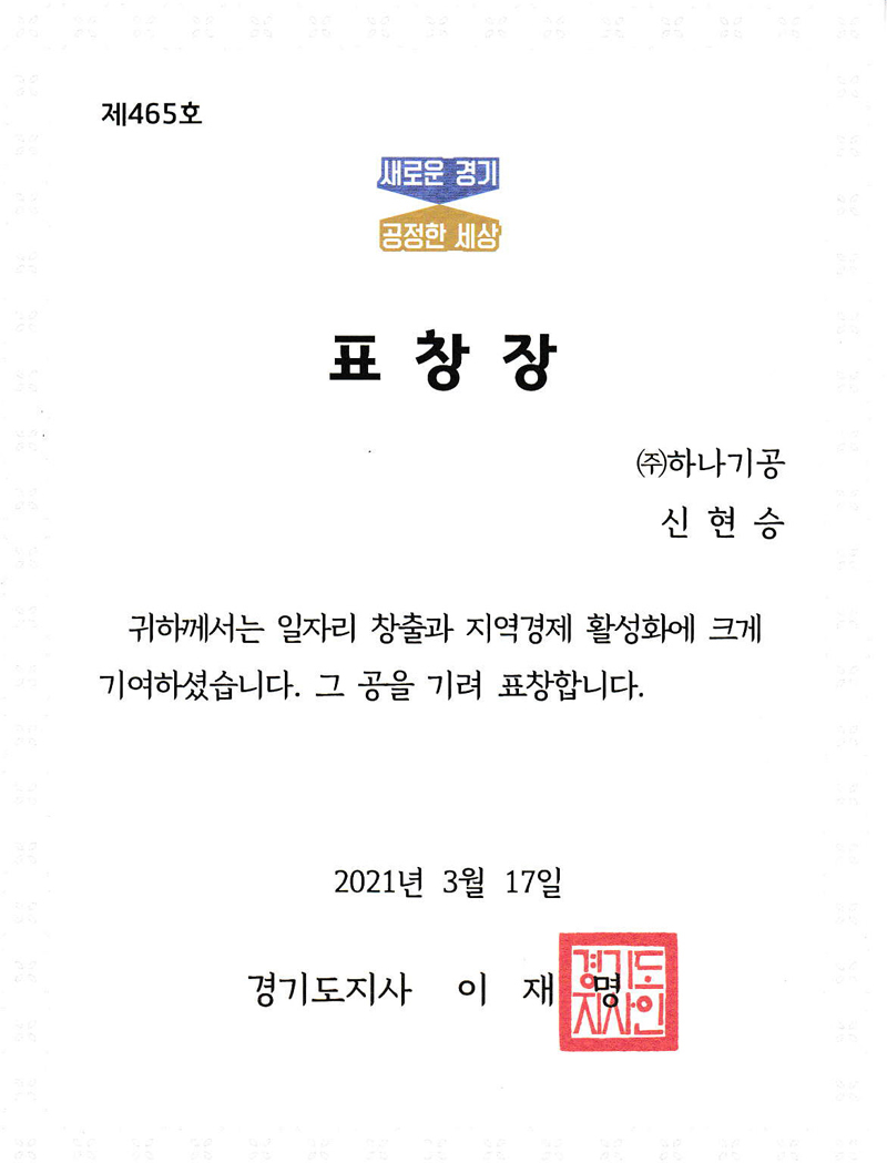 2021 상공회의소의 날을 맞이하여 (주)하나기공은 경기도지사 표창을 수상하였습니다.