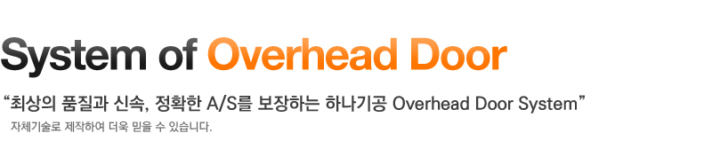 (주)하나기공은 Door의 판넬 및 구성부품, Moter Operator와 Control 일체를 자체기술로 개발, 제작하고 있으며 방대한 물량의 부품이 항상 Stock 되고 있어 필요한 부품의 적기 공급으로 최단시간의 납기와 A/S 체제를 완비하고 있습니다.
